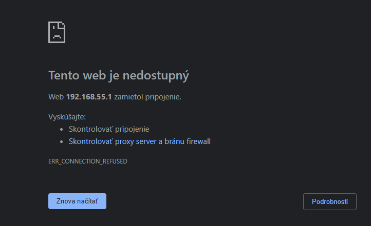 Ak ale toto zadám do Chrome tak dostanem iba... 192.168.55.1 zamietol pripojenie (vid príloha)
