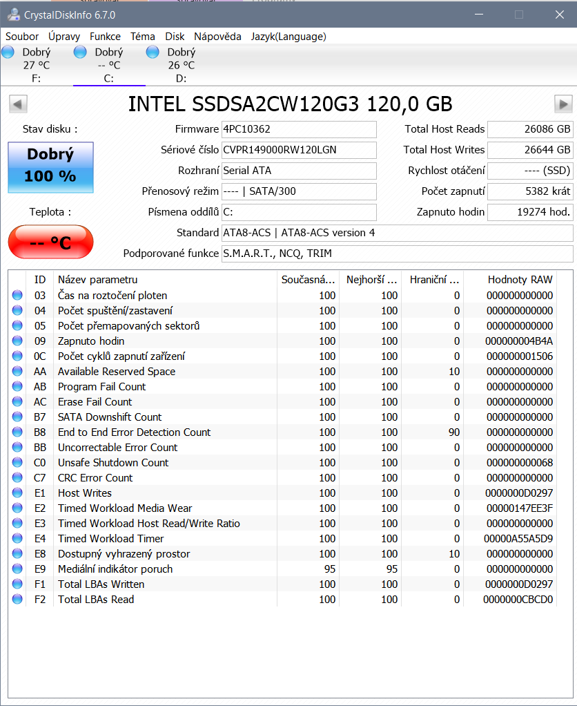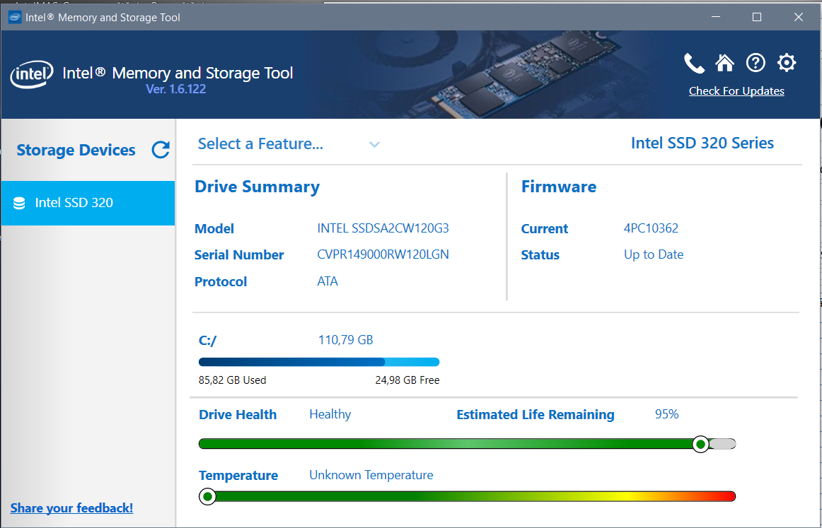 Mám pro W10 systémový SSD Intel SSD 320 Series a naposled jsem se díval na Drive Health někdy v létě a bylo to 98%. Dnes mě napadlo se znovu podívat na stav a je tam 95%.
