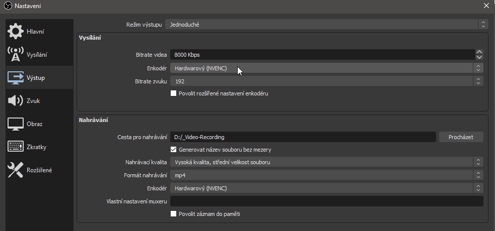 Output pouzivam simple mode, 3Mb bitrate a sw encoder pre streaming a high quality, mkv a sw encoder pre recording.