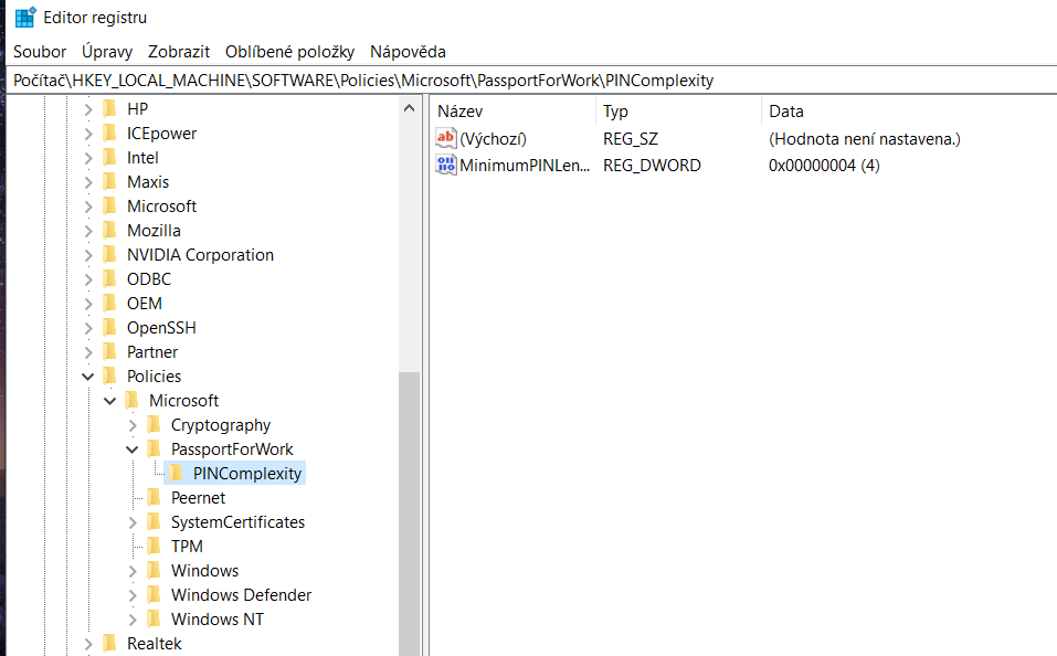 ale notebook mi gpedit.msc nenašel a v regedit jsem nenašel PassportForWork