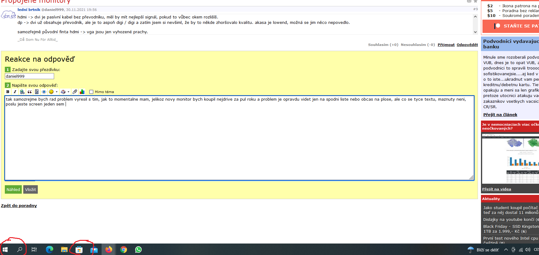 Ahoj, mám pomocí této redukce https://www.euronics.cz/redukce-i-tec-hdmi-vga-cerna-itchdmi2vgaada/p536572/ propojené 2 starší LCD monitory v PC, obraz na 1 (starším z těch 2 - BENQ) je úplně v pořádku ostrý, ale na druhém (novějším philips 223V) mám občas text, ale hlavně je to vidět dole (viz foto) rozmázlé ikony či text, je to lehce viditelné, ale divím se proč tomu tak je?