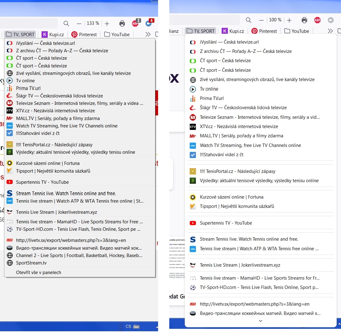 Po aktualizaci prohlížeče Firefox z verze 91 ... na verzi 92.. a vyšší se změnila grafika rozbalovacích "roletek" z lišty záložek. Zvětšilo se řádkování, písmo se naopak zmenšilo, je méně syté. Delší "roletka" s více záložkami se pak nevejde va monitor a musí se posouvat. Na obrázku vlevo dosavadní stav, vpravo po aktualizaci. To se mně příiš nelíbí, aktualizaci jsem proto "vrátil", nyní zase jsou obtěžující nabídky na aktualizaci a provoz neakualizovaného prohlížeče není "to pravé ořechové".