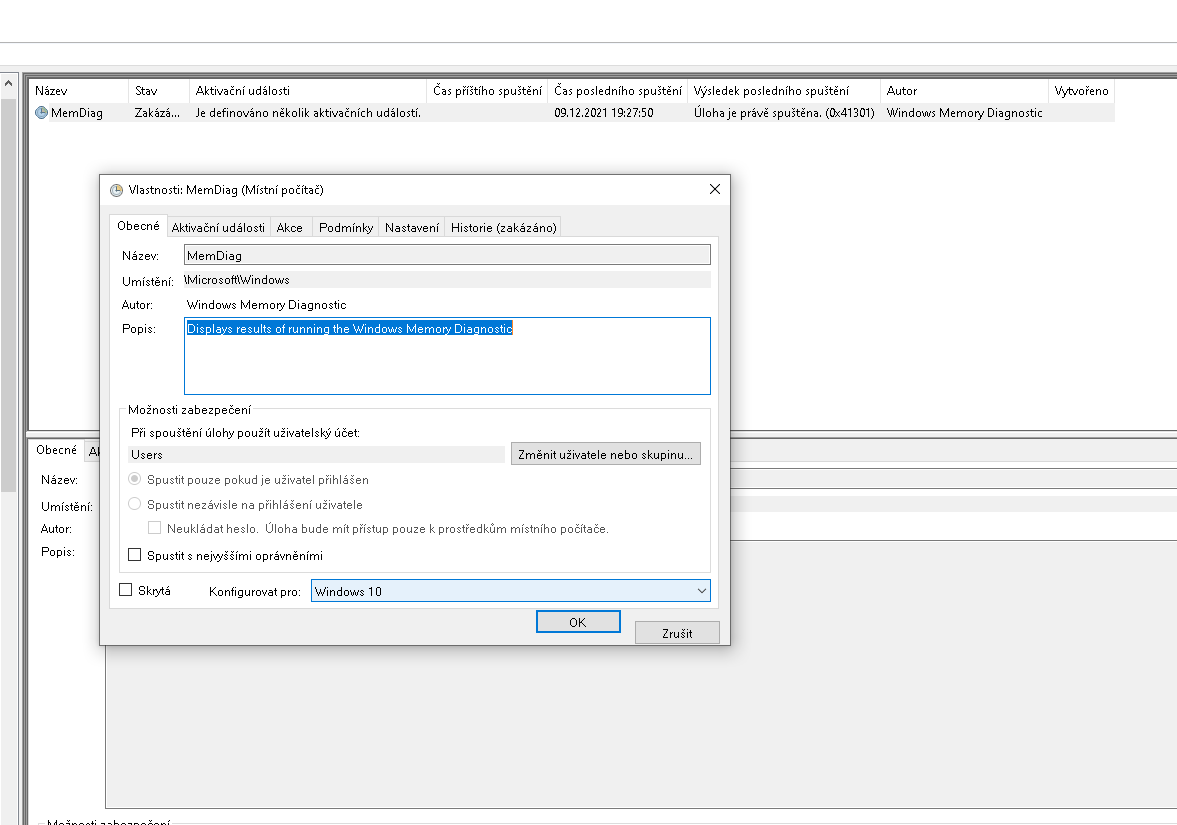 V plánovači úloh byla spuštěná úloha která odkazovala na C:\Windows\System32\MdRes.exe, kterou jsem zakázal.