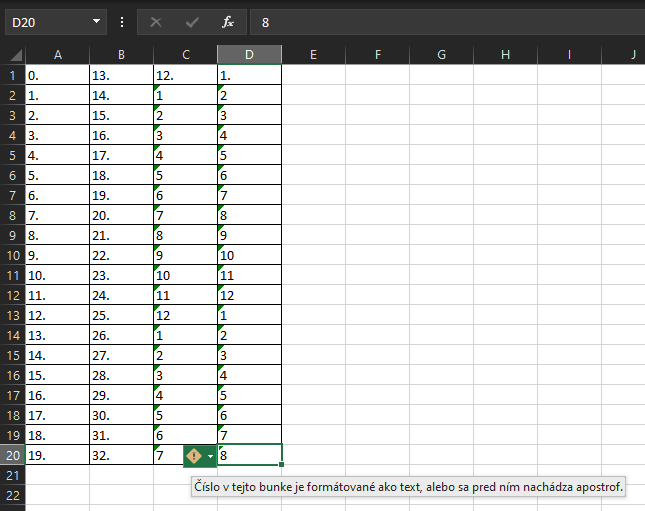 V prvom stĺpci som napísal "0.", potiahol do dola pre automatické doplnenie a doplnilo mi to presne tak ako je na obrázku. Tak isto je to aj v druhom stĺpci, keď začínam od čísla 13. Pokiaľ však začnem číslom n (n >= 1 && n <=12), tak to urobí to, čo je vidieť na obrázku v stĺpcoch C a D -> v stĺpci C som začal s "12." a v stĺpci D som začal s "1.".