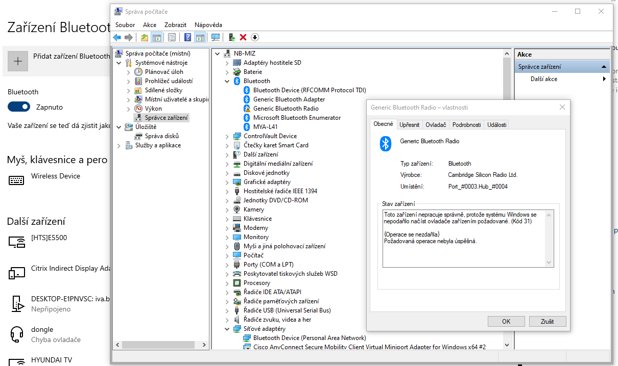 Bez adaptéru se notebook tváří bez problémů. Jak tam dám adaptér, mám v nastavení "dongle chyba ovladače" a ve správci zařízení vykřičník u Generic Bluetooth Radio (viz příloha).
