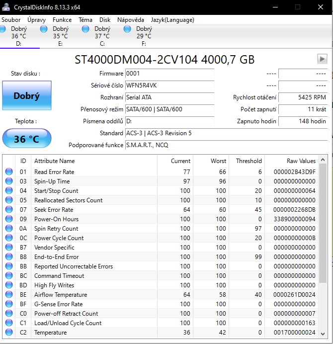 5. Disky můžeš taky otestovat, každý výrobce má na svém webu testovací program. Pro rychlou orientaci postačí CrystalDiskInfo, status S.M.A.R.T.