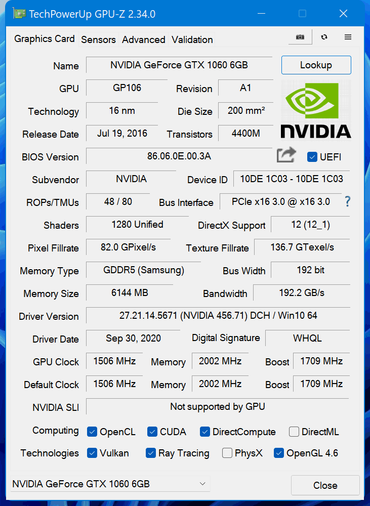 Grafiku mám GeForce GTX 1060 6GB (4095 MB)