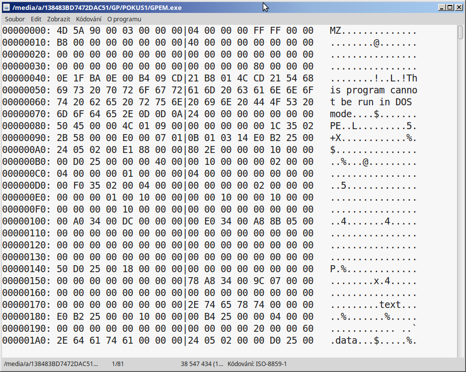 Pokud zmizela ikonka, mohlo dojít k poškození souboru. První kontrola je kouknout na něj jako na text (v TC klávesou F3), měl by začínat magickým slovem, které vypadá jako MZ jak už tu bylo řečeno (pokud tam nebude, je to jasné, pokud tam ale je, ještě to nic nemusí znamenat). Také by v okně vlastností na kartě podrobnosti mělo být vidět něco smysluplného v kolonce výrobce, verze atd. V příloze dávám pohled na náhodně vybraný exáč (no najít v linuxu windowsovský exáč mi dalo trochu práce), kromě MZ by měla být vidět taky podobná struktura, položky jako .tex, .data, a další by tam měla být skoro jistě, pak nějaký ten binární šrot (vlastní program) uprostřed, ke konci pak bývají čitelné textové řetězce, ale to myslím není pravidlo.
