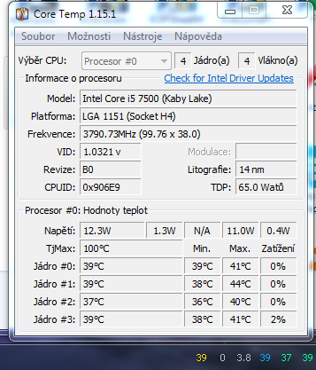 Skus si nainstalovat tohle, (viz. obr.) ukazuje to teploty všech jader, minimální, aktuální i maximální. Aktuální si můžeš dát na spodní lištu a krom toho to ukáže na kolik můžeš konkrétní CPU ohřát. Krom toho to ukazuje okamžité zatížení a frekvenci.