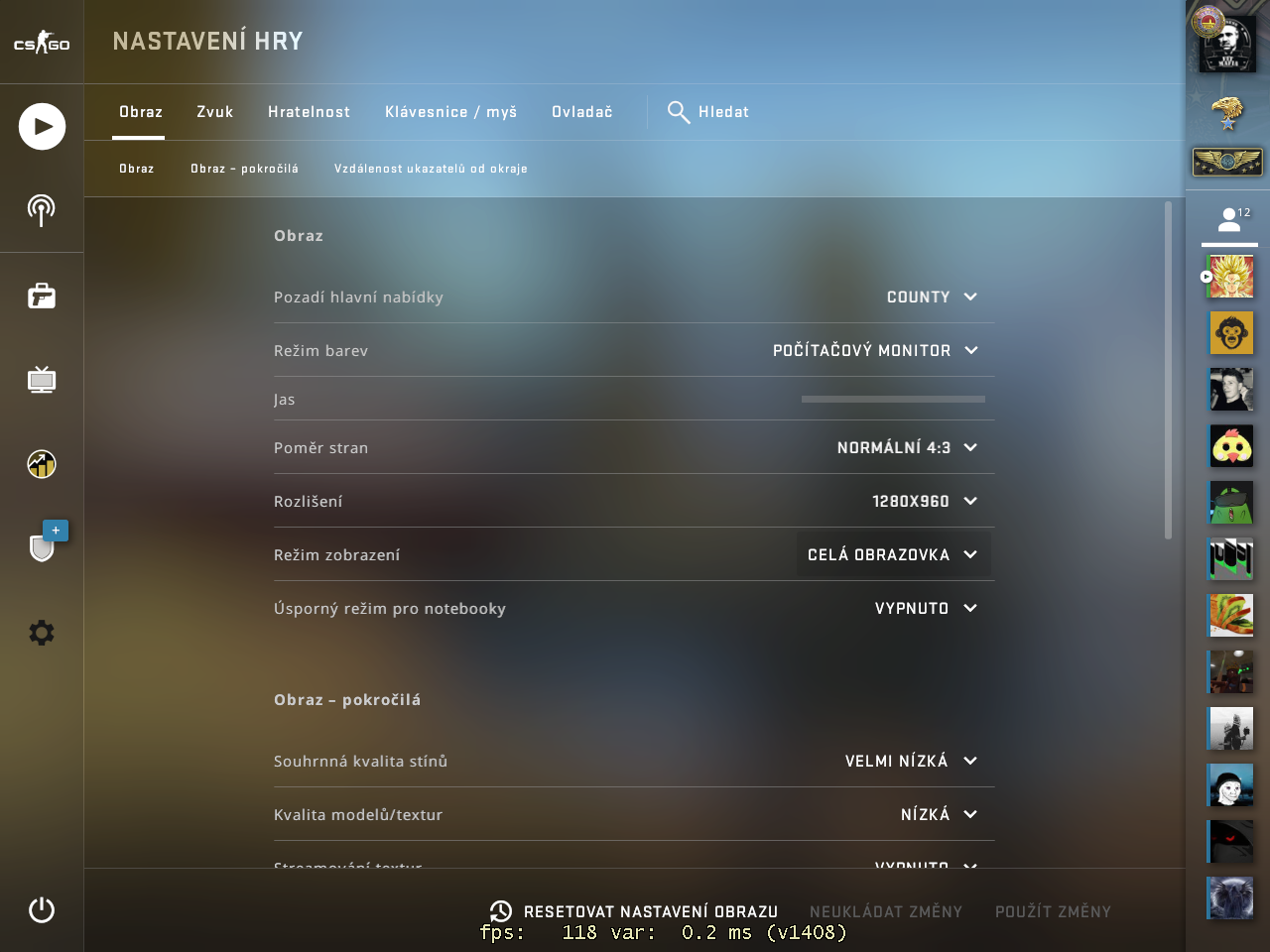 Rozlišení 1280 x 960 (prostě 4:3) pro csgo normální díky roztáhnutí obrazu na 16:9 monitoru se ti vše roztáhne a tobě se pak lépe míří na nepřítele edit: + menší rozlišení zvyšuje FPS, hrají na tom i profesionální hráči