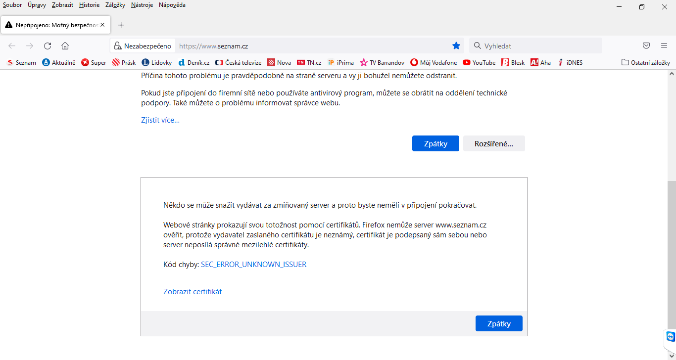 Máš to tam napsané, oč se jedná. Ten localhost certifikát ti určitě neposílá Seznam, tak prostě zjisti co/kdo posílá ten localhost certifikát, mezi Seznamem a prohlížečem je něco, co upravuje komunikaci, tip, co by to mohlo být, máš v těch hláškách a tedy antivirový program. Jestli to není ten, tak přece nebude až tak složité přijít na to, co to je.