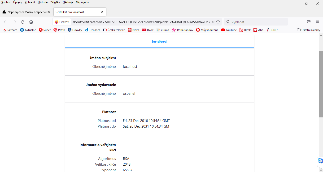 Taky je v nastavení Firefoxu možnost nekontrolovat certifikáty. Mám Firefox 96.0.3 na Windows 10.