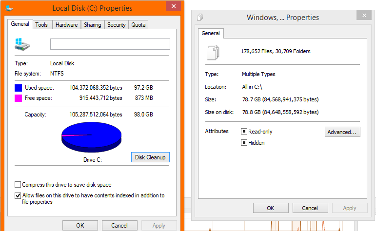Zkusil jsem v základním adresáři C: vybrat všechny složky a zobrazit si vlastnosti, pro součet všech dat... Viz screen: