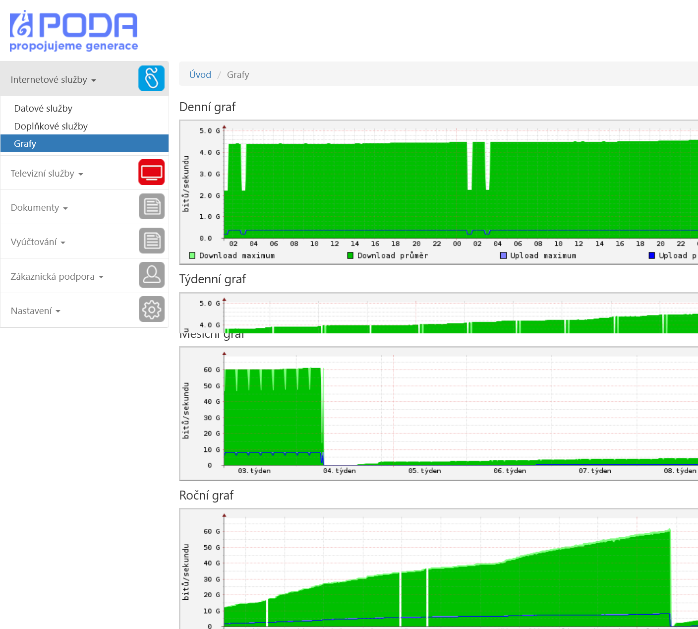 vidět graf rychlosti připojení v závislosti na čase v průběhu dne, týdne, měsíce i celého roku.