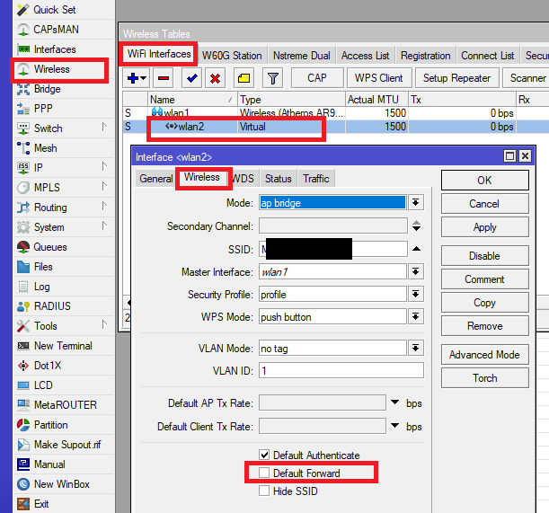 - dnes stačí pro nastavení "sítě pro hosty" pouze dva údaje, jméno sítě a heslo. Aby "hosté" nemohli do "hlavní sítě", je potřeba odškrtnout v Wireless - WiFi Interfaces - vybrat vituální wifi - záložka Wireless volbu Default Forward.