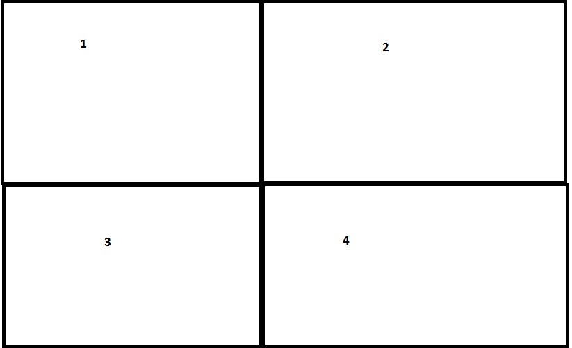 <frameset rows="*,*" cols="*,*"> <frame src="frame_1.html"> <frame src="frame_2.html"> <frame src="frame_3.html"> <frame src="frame_4.html"> </frameset>