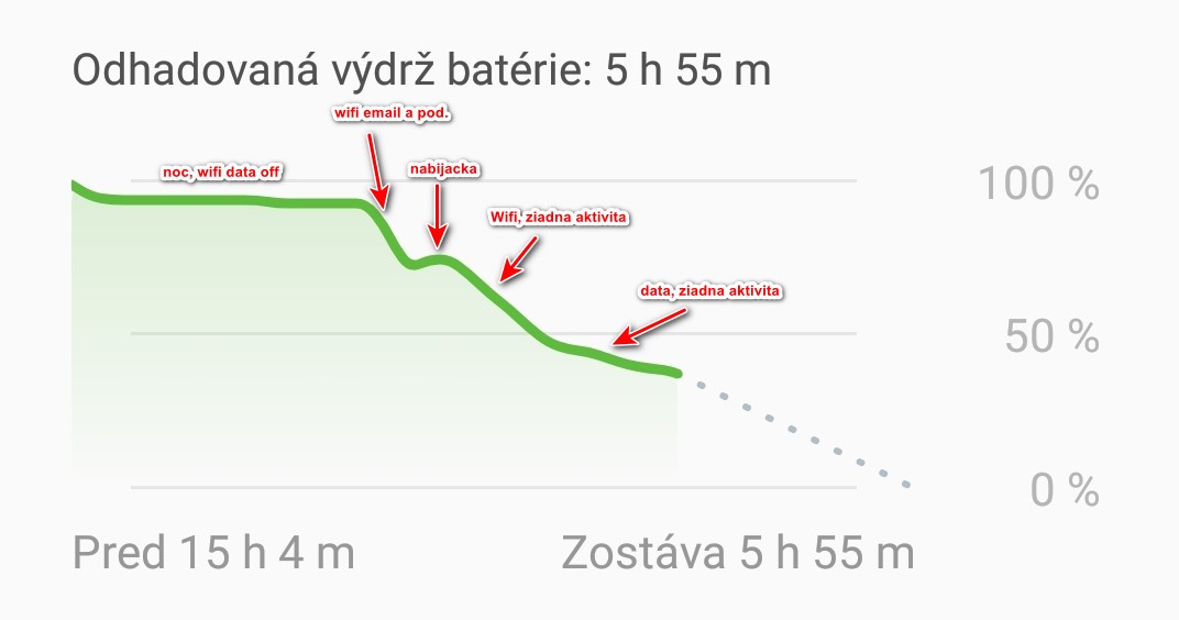 Pri pripojeni na Wifi pada krivka baterie 45 st. , pri data ma sklon 15st odhad . . . Signal je v pohode, vedlajsia izba, a je jedno ci na 2,4 alebo 5 . . . to som schvalne nechal telefon niekolko hodin bez uzivania na Wifi , potom prepnute na data