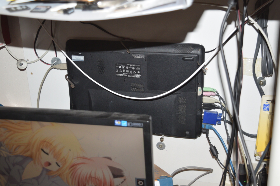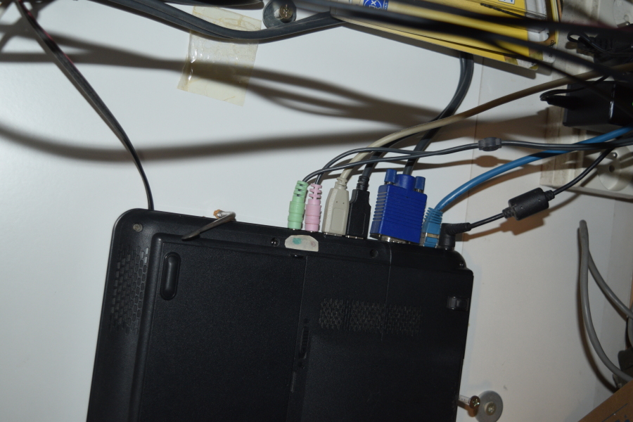 Tak tady o žádné předělávání nešlo, ten NB je normálně sundavací a zastamdací. Na něm žádná úprava nebyla. Takže spíš jako mit stodolu po dědovi, a střídave tam parkovat auto a nebo vlek pro pořádný člun - ono tady ty kabely VGA+klávesnice+myš taky vedou k přepínači (mimo obraz), do kterého vedou i kabely od několika rackových počítačů a jednoho servříku, co je nahrubo přivrtaný na boku dřevěné skříně jako sada navzájem prodrátovaných součástek, co ani není v casu a chlazení má pasivní od vzduchu, co volně proudí místností - výhoda je, že nemá žádné větráky, i ten ve zdroji je vyřazený, a tak je provoz naprosto tichý :-p
