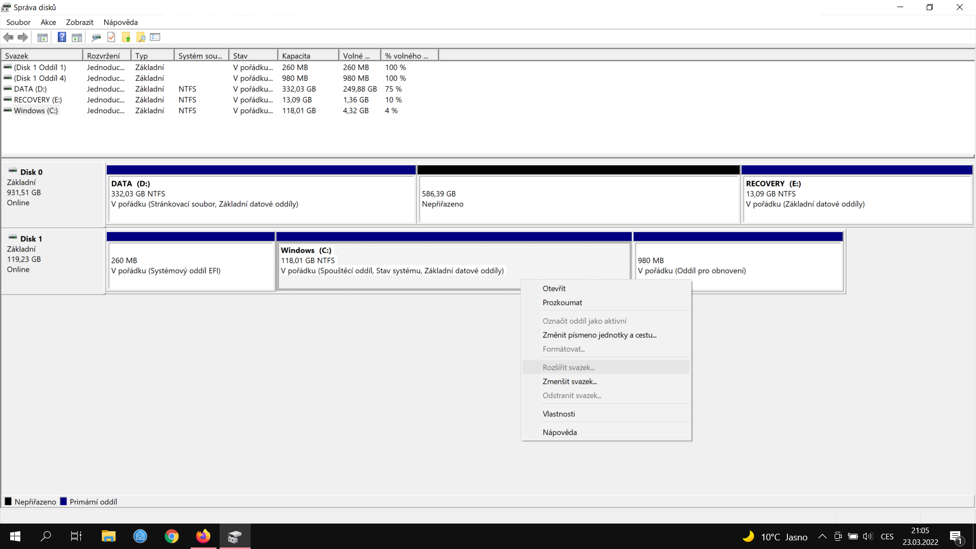 Velikost jsem D-čku vzal a když kliku pravým na C-čko, nejde mi rozšířit. Asi proto, že jsou rozdělené jako Disk 0 a Disk 1. Dá se tohle nějak obejít? Případně udělat i za cenu zformátování Dčka kompletně? Nechci reinstallovat Windows a všechno "dělat" znovu.