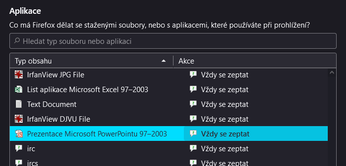 Pak se ti typ suboru PPS objeví v nastavení Firefoxu a nastavíš mu Vždy se zeptat, jak jsem dával obrázek výše. Uf.