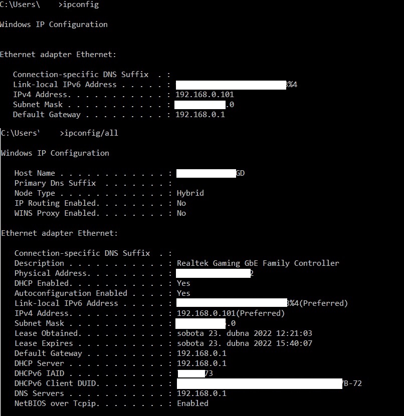 hodnoty v ipconfig jsou stejné když nejde i když jde- tedy nic navíc tam není