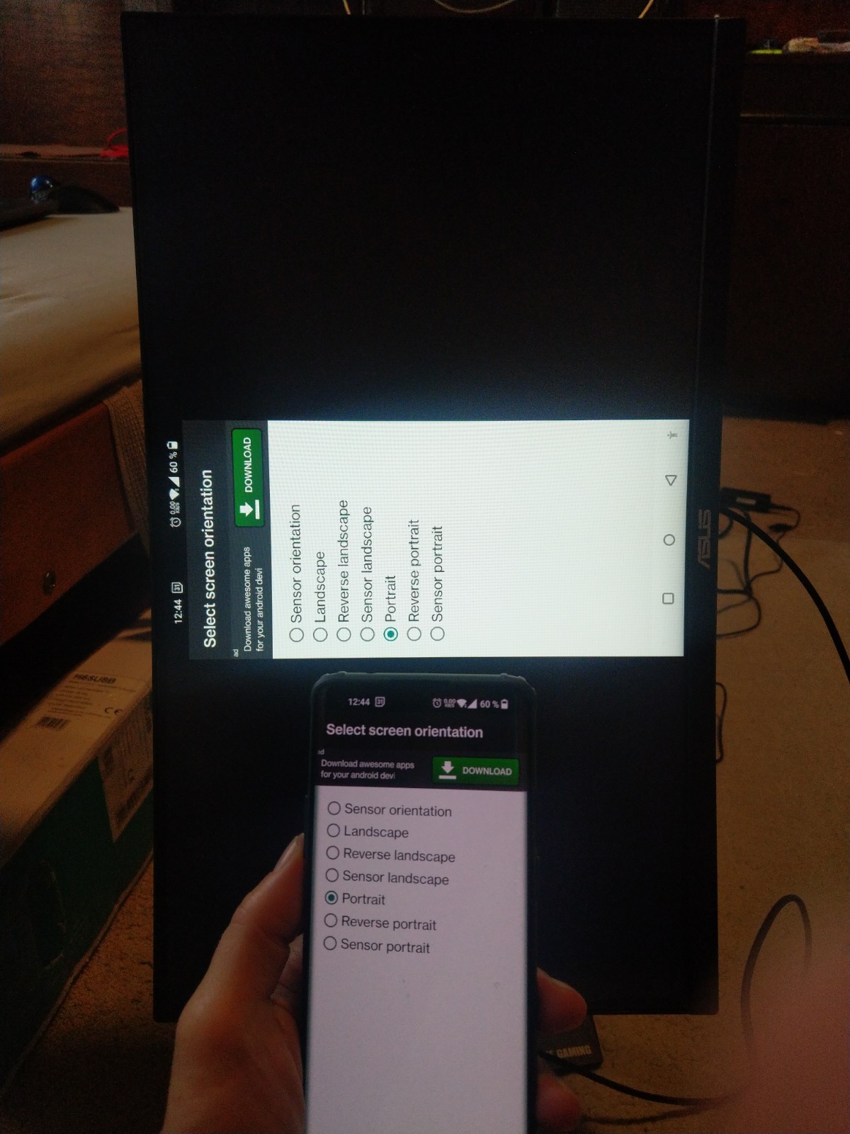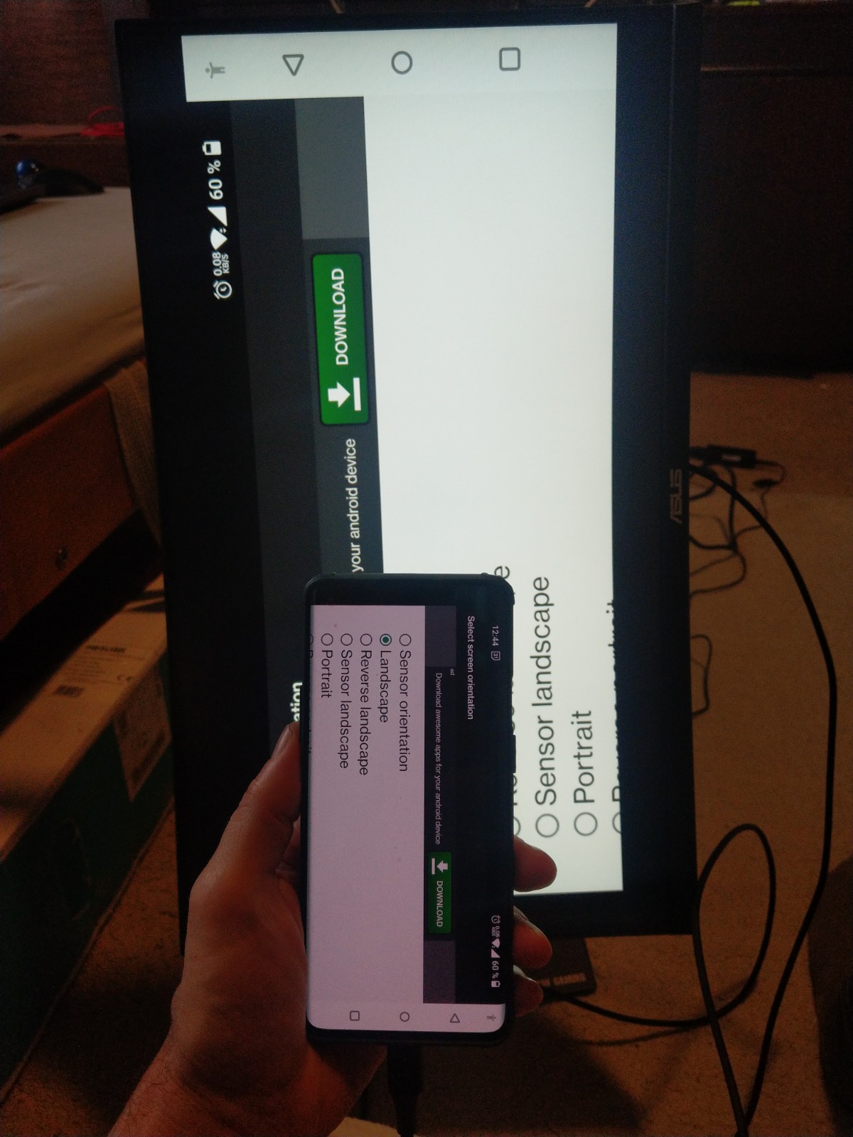 no v monitoru težko, keď otočil mobil. čo je tam nainštalované nikto nevie a čo si vyskúšal ty tiež. https://play.google.com/store/apps/details?id=com.farmerbb.secondscreen.free&hl=en&gl=US