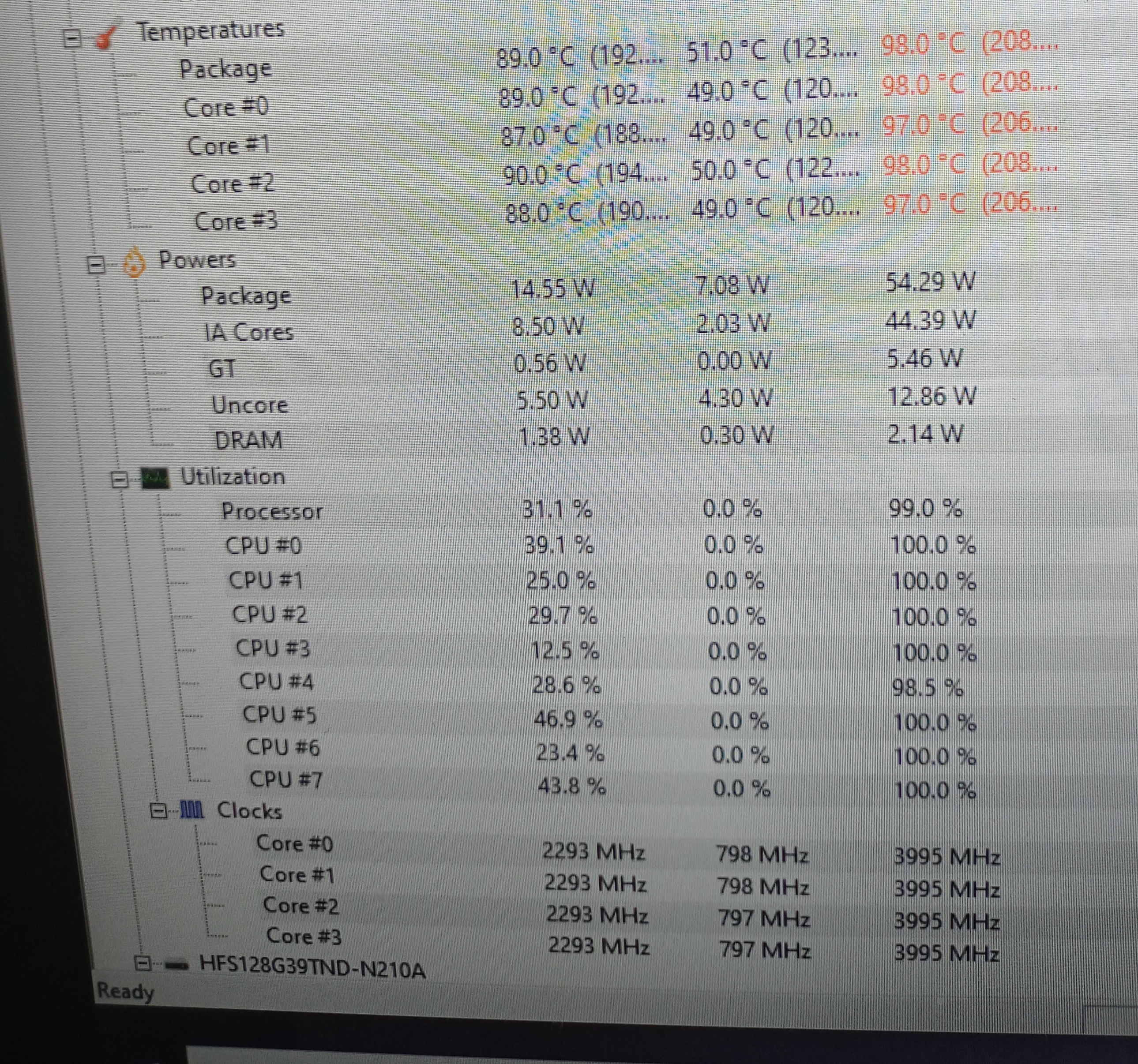 Bojím se, aby se mne neprehral notebook při hraní hry, po pár minutách ve hře začne o dost víc pálit povrch notebooku u napájení a dalších pár míst. Tak se chci zeptat jestli je normální vyšší teplota nebo je to první ukazatel, že i tam dole mezi důležitými součástkami dochází k tak vysoké teplotě, v příloze posílám údaje o teplotě notebooku při hraní, nevím jestli ty ukazatele znamenají, že už něco je v nepořádku nebo je to v poho teplota, tak snad někdo kdo to má víc v oku poradí ,děkuji :)