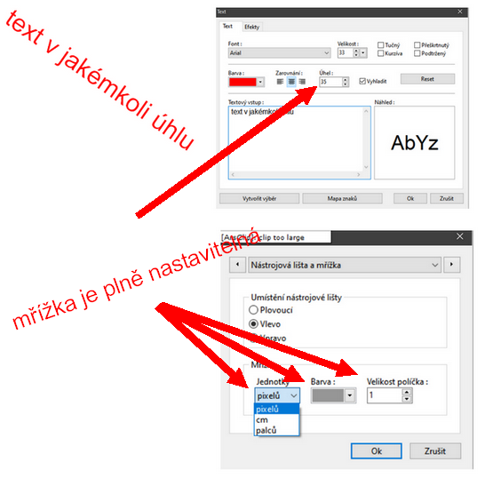 Já bych použil PhotoFiltre. Je free, česky, portable, textu jde dát jakýkoli úhel a mřížka jde rovněž nastavit.