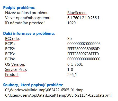 Stolní PC : W7 ULTIMATE 64-bit; GIGABYTE GA-H81 M-HD3; Pentium G3450; HyperX Fury Blue 4GB; SSD 840 EVO 120GB; WD 250GB; WD 500GB; LG GH24NSB0. Občas se objeví během provozu, nebo i ihned po startu /zapnutí/ PC obrazovka „BlueScreen“. Vím jen, že může být problém HW i SW. Pomůže někdo ze „souborů popisujících problém“ vyčíst, zjistit a případně poradit co v těch souborech hledat, na co se zaměřit, aby pak bylo možné cíleně a ne nahodile zasáhnout. Event. jakou „údržbu“ systému provést. „Soubory popisující problém“ jsou k nahlédnutí, cca 1 měsíc zde: https://www.uschovna.cz/zasilka/ZM7X3D8DF67754GP-V82/