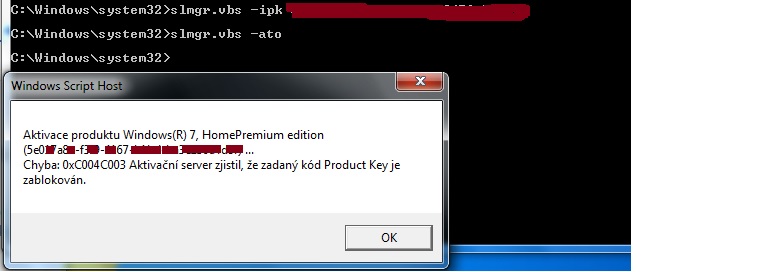 Následně bylo potřeba ručně aktivovat pomocí příkazu slmgr.vbs -ato a tam mi bohužel vyjelo, že je product key zablokován, ale to hlavně možná i díky kroku (který jsem dělal samozřejmě ještě před tímto popisovaným krokem s aktivací pomocí příkazového řádku z tohoto návodu - http://www.servispckupka.cz/jak_aktivovat_windows_7_zmena_produktoveho_klice.php), kdy mi tady radil dotyčný uživatel „Sodrak v 8:10“, který říkal, že příkaz slmgr -rearm vymaže původní aktivaci a poté mám postupovat klasicky, tedy normálně aktivovat jako obvykle - to jsem udělal, a Microsoft mi klíč zablokoval, viz moje odpověď na jeho radu viz čas 21:18 (6.7.2022).