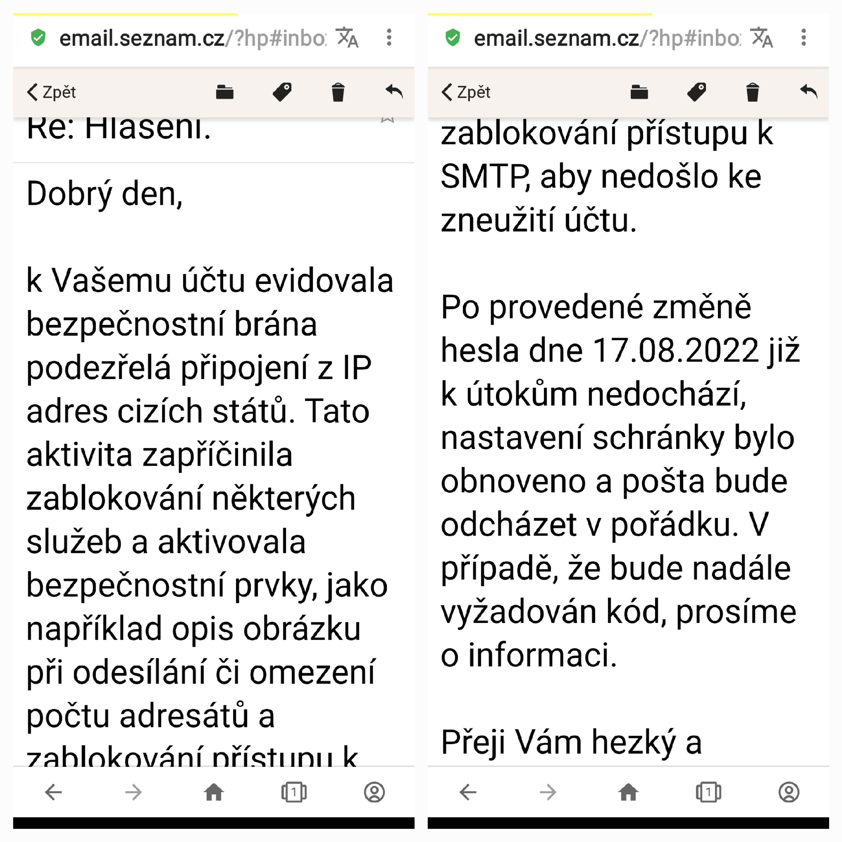 děkuji za radu.Nyní jsem na zkoušku zkusil odeslat email přes mobil na gmail z mého seznamackeho "blokovaného" emailu a opravdu dorazil...Zkusil jsem na mobilu vypnout data a odeslal jsem přes WI-FI se stejnou IP adresou jako má PC a také dorazil...tak to jsem snad na dobré cestě...bál jsem se že je blokovaná fyzicky emailová adresa novak@seznam.cz to by byl asi konec.Pro mě je ten email hrozně důležitý.Jinak prohlížeč používám Mozillu .