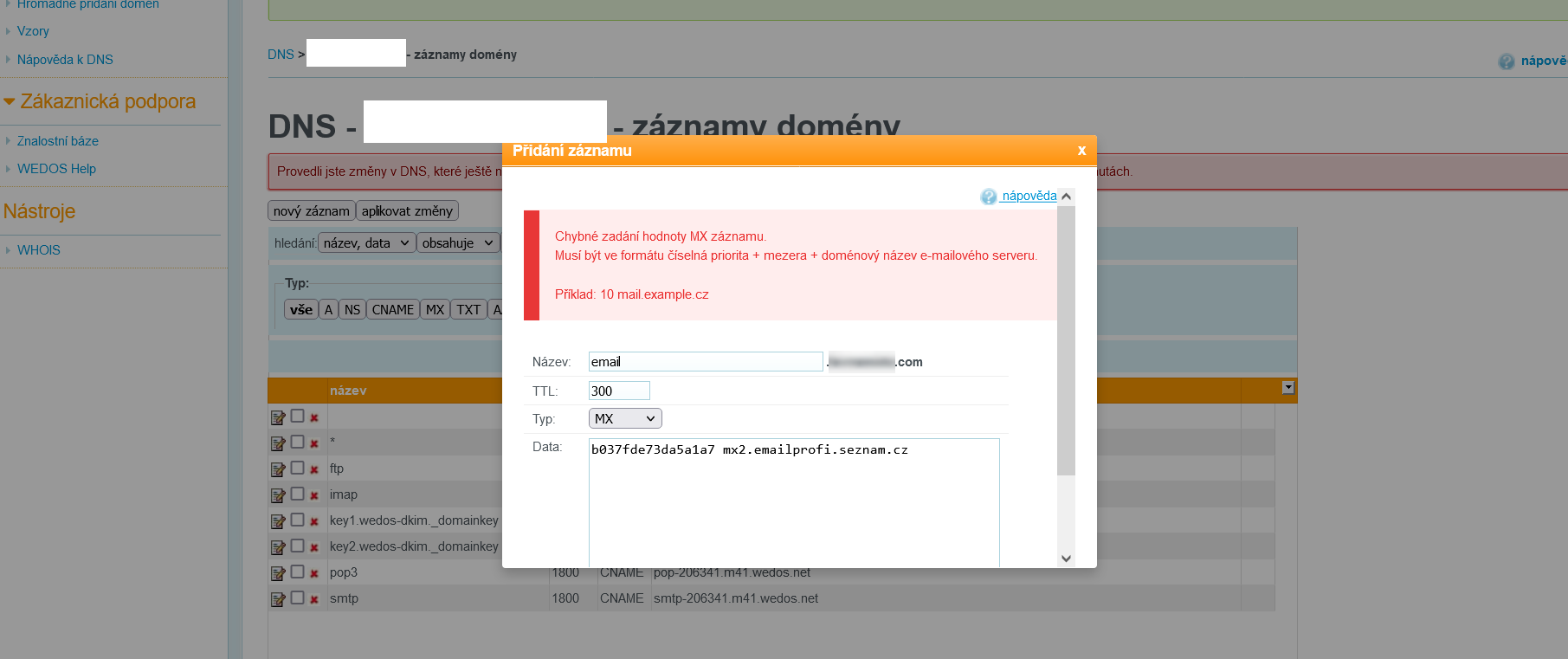 Ahoj všem...tak jsem se rozhodl ,že si založím nový email profi od seznamu na doméně a přesměruji tam emaily.Je to asi nejlepší řešení.Jen bych ještě poprosil o radu ,jestli někdo neví ,kde dělam chybu.Nedaří se mně v DNS změnit záznam .Nevíte kde dělám chybu.Pořád to píše ,chybné zadání.