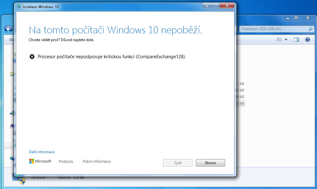 Na tomto počítači W10 nepoběží (podpora procesoru kritické funkce CompareExchange128)