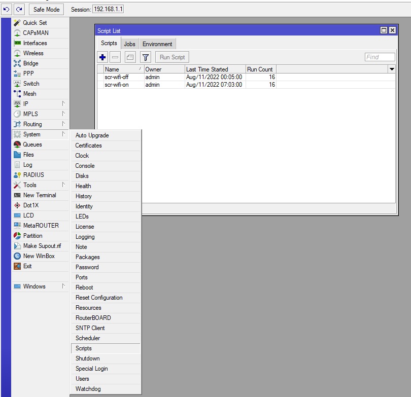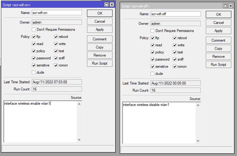 Na mikrotiku mam vytvorenych niekolko skriptov ohladne wifi, zapnut, vypnut, rozne dni, rozne casy, rozne interface.