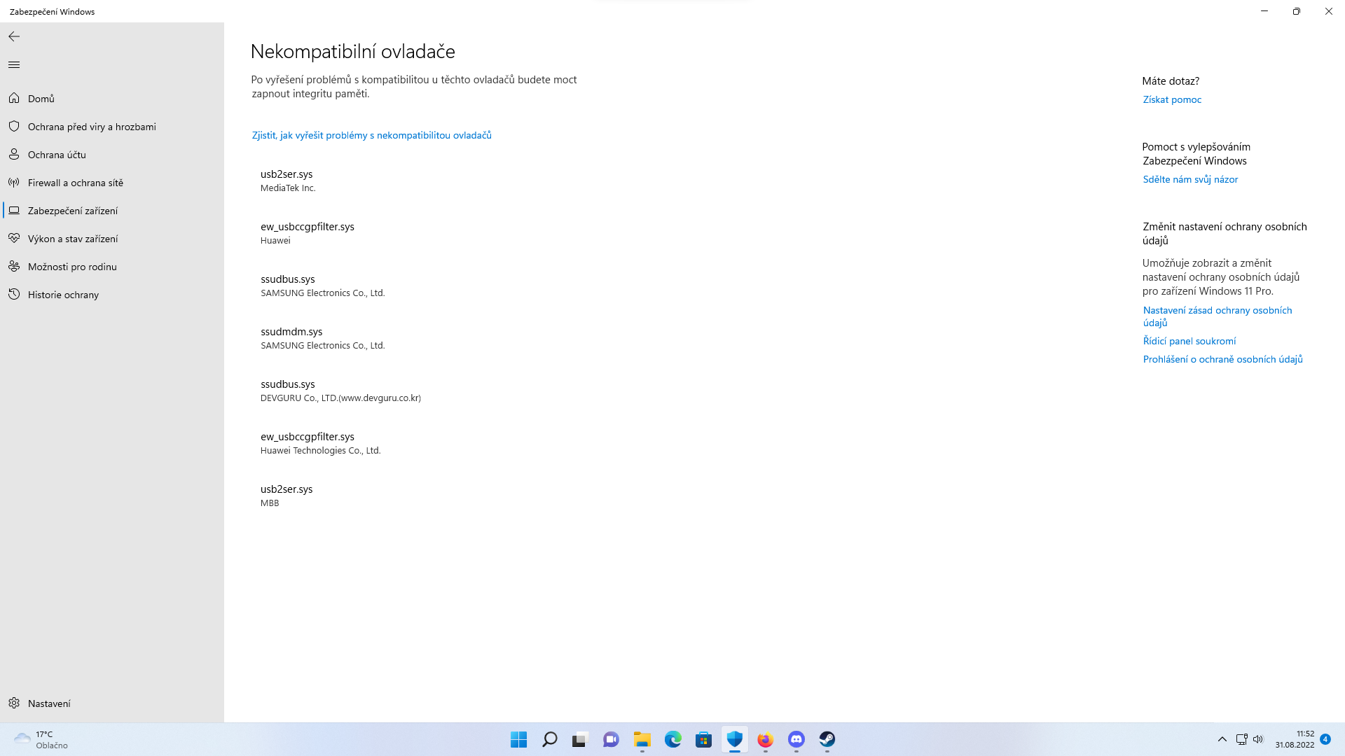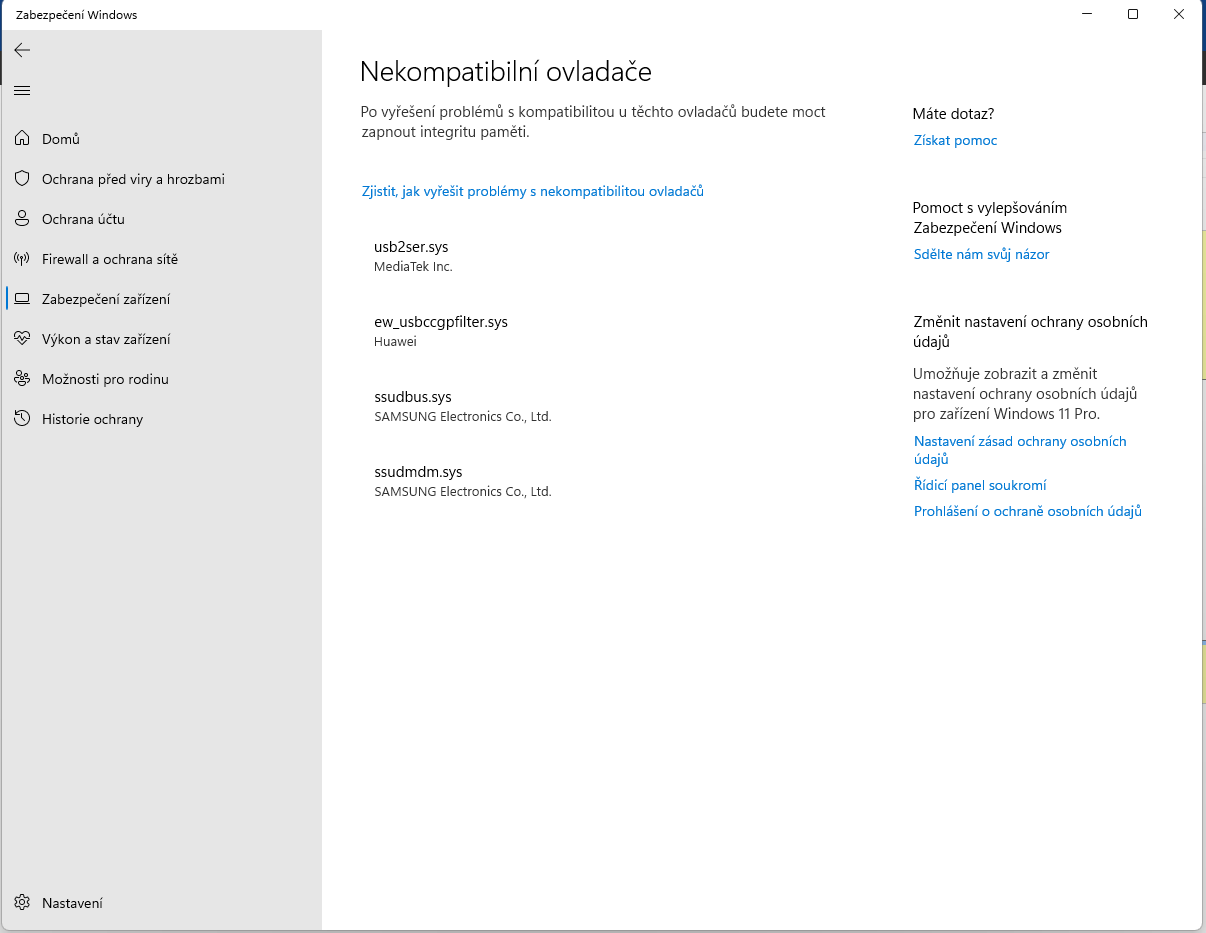 Zdravím, dnes ráno, my windows defender ukázal že mi nefunguje, neboli spíše že mám vyplé Izolační jádro, když ho chci zapnout nejde to, kvůli nekompatibilním ovladačům, ovšem chápu že mám ty ovladače aktualizovat, ale jak, popřípadě kde?