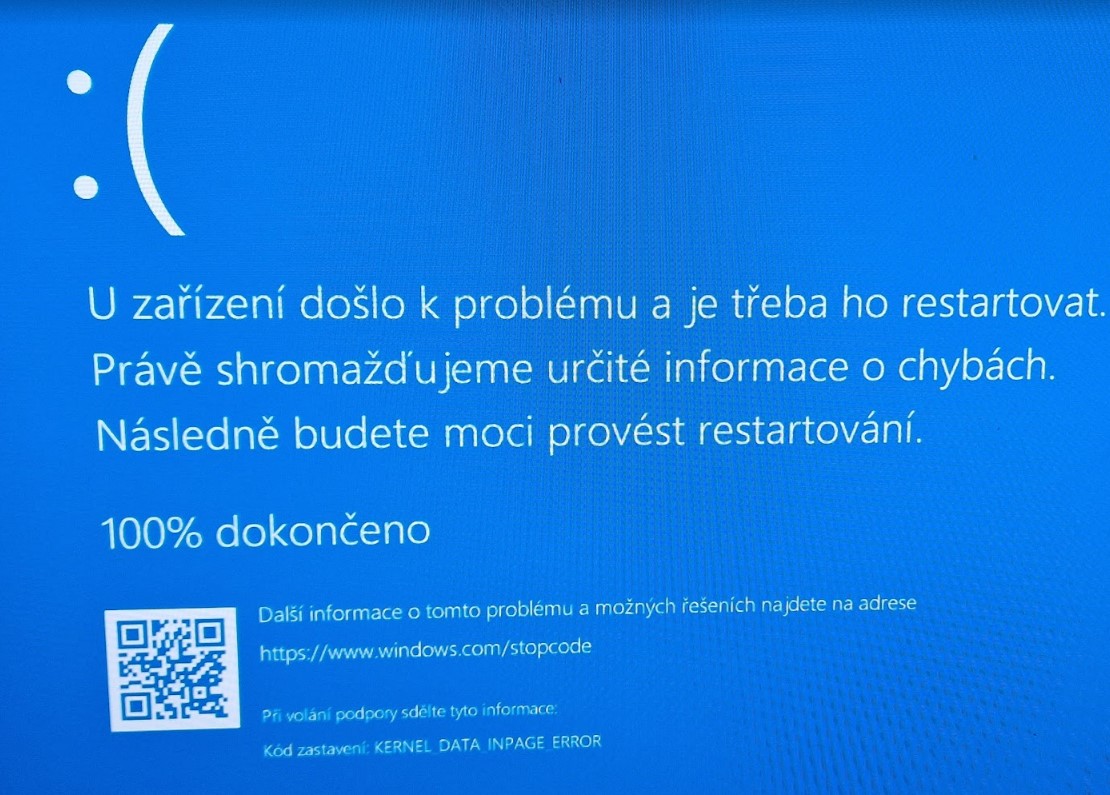 Chyba na stránce s daty jádra naznačuje, že je problém s pamětí počítače nebo pevným diskem. Možná má pevný disk nějaké vadné sektory nebo je něco špatně s fyzickým připojením. Moduly RAM možná nejsou správně nainstalovány.