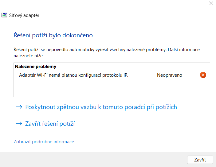 Konkrétně mi to vyhazuje hlášku: Adaptér Wi-Fi nemá platnou konfiguraci protokolu IP.