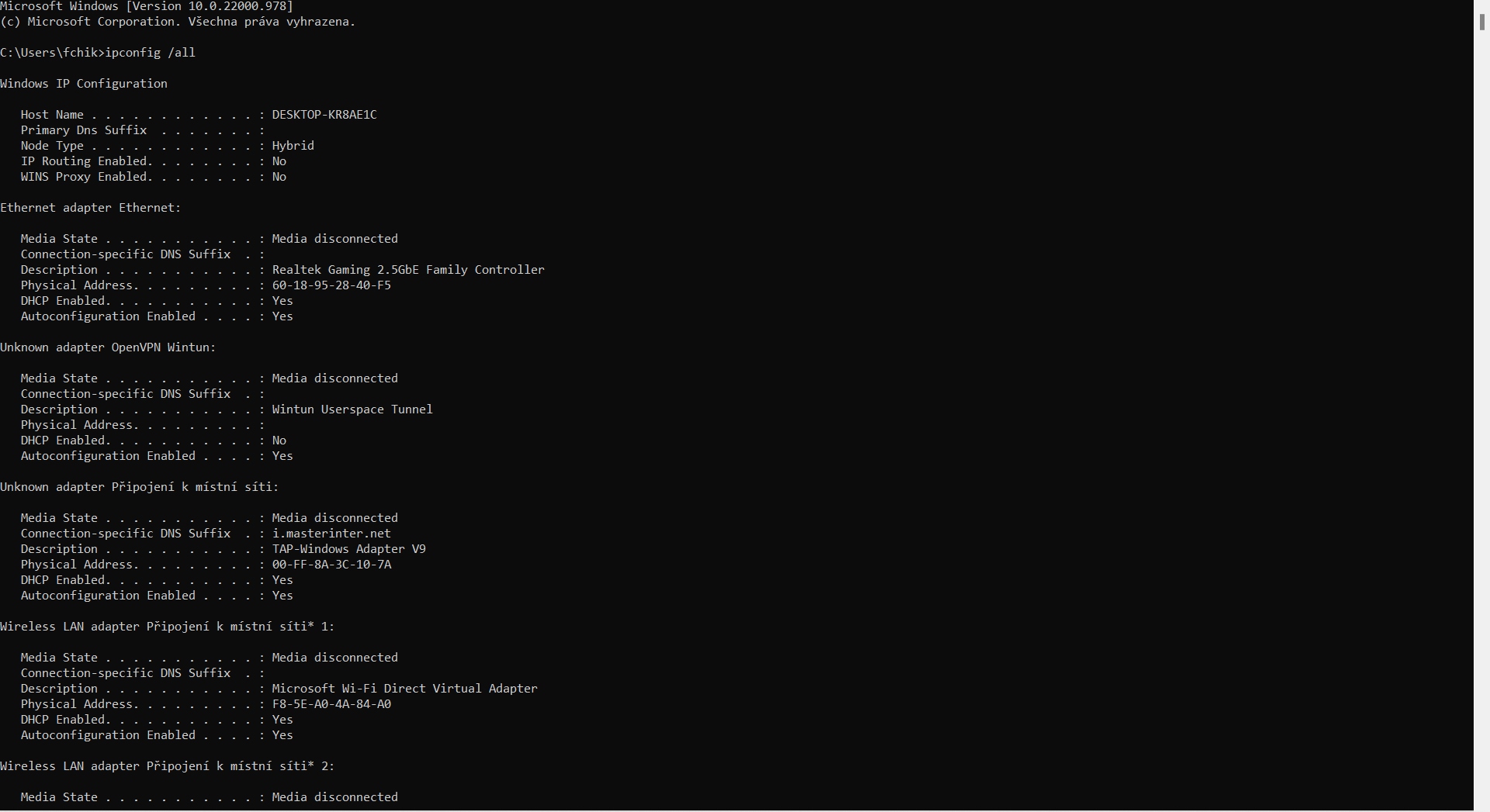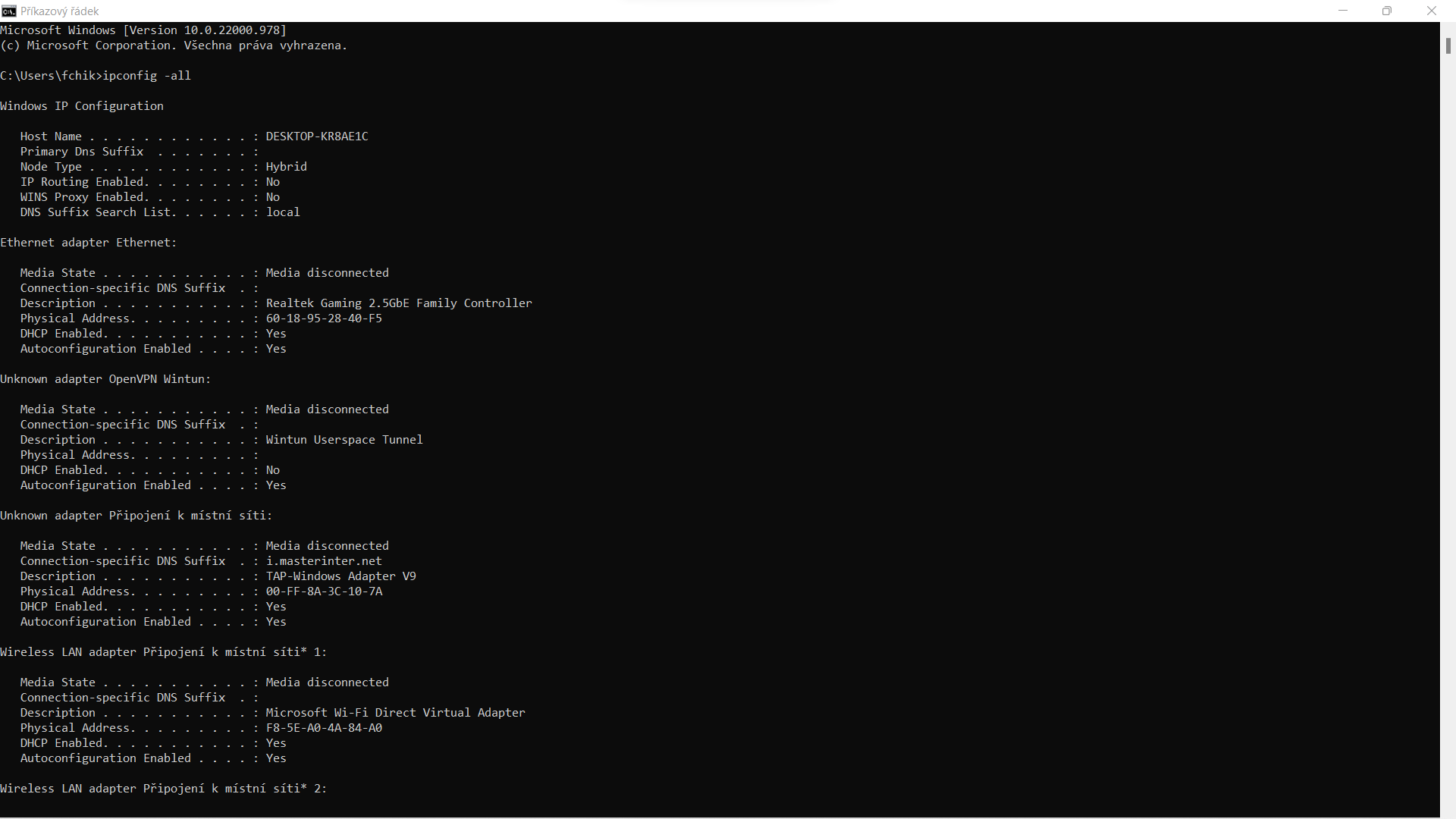 Přikládám i výpis ipconfig /all aby jste se podívali, kde je třeba chyba. Nejsem žádný profík.