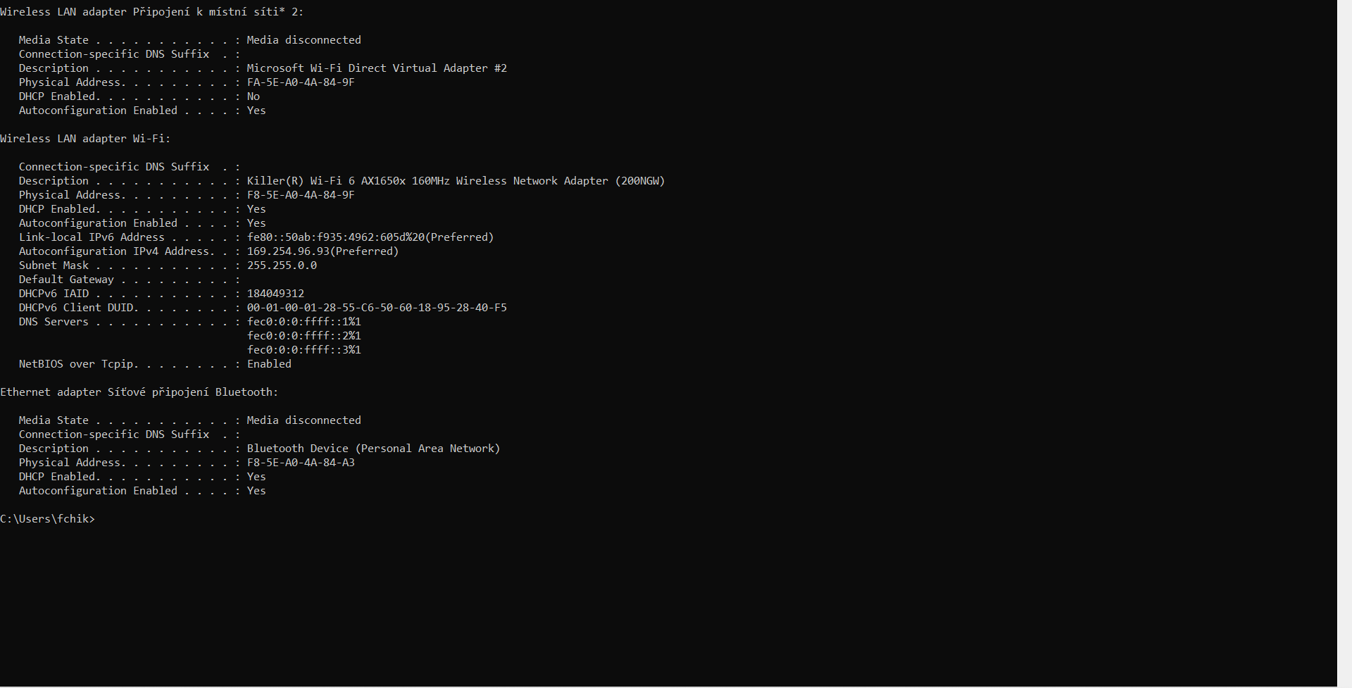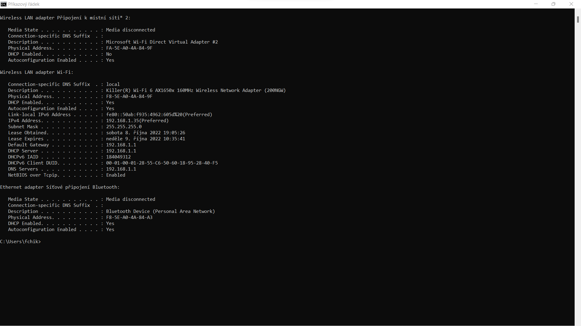 zároveň v tomto stavu bude dobré si opsat získanou konfiguraci, viz příkazový řádek cmd.exe: