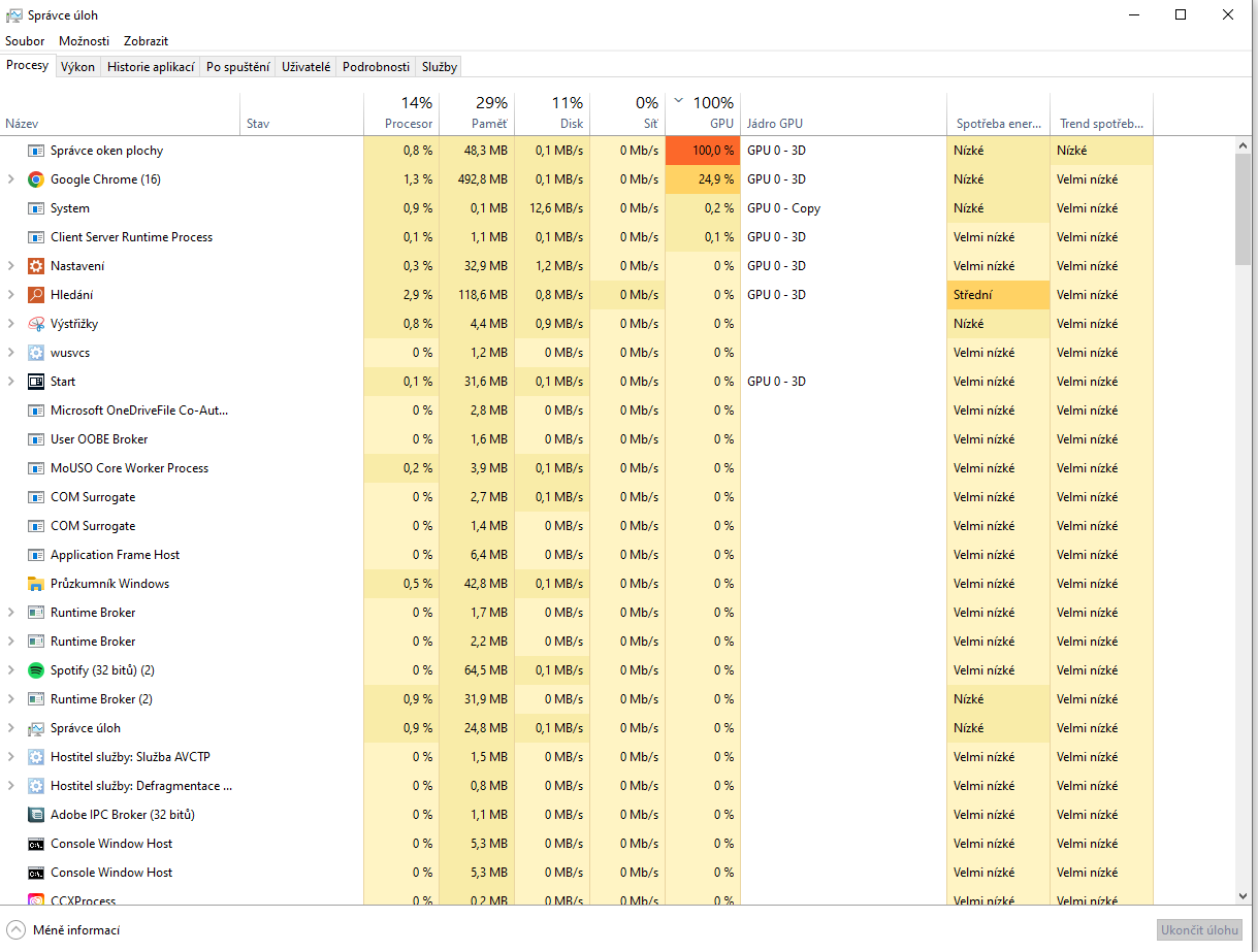 Správce oken si taky hodně bere (pokud se to seřadí, bývá na předních místech), ale na 100% jse se s ním nikdy nedostal, spíš tak do 20%. Zatím jsem se ve windows 10 ani nesetkal s tím, že by padnul, nechci to zakřiknout, v dřívějších verzích se to stávalo a narozdíl od linuxu, ve windows ho zrestartovat neumím (pokud to vůbec lze; v linuxu stačí dřív než s sebou vezme celý systém v nastavení vybrat jiného správce oken a pak klidně znovu toho výchozího, je jich tam na výběr několik).