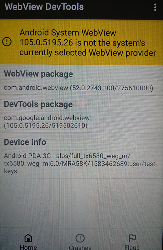 Doniesol mi známy zariadenie, ktoré slúži ako Virtuálna pokladnica. Je to Android zariadenie (Android verzie 6.0) spolu s integrovanou tlačiarničkou. Problém je v tom, že v ňom neviem rozbehať novú aplikáciu VRP 2. Táto, podľa vyjadrenia výrobcu aplikácie, potrebuje Android verzie 5.0 a vyšší a nainštalované Webview. Problém vidím vo Webview. Podarilo sa mi nainštalovať do zariadenia rôzne verzie Webview, ale aplikácia sa nespustí (spusti sa, ale zobrazí len bielu obrazovku). Webview po spustení zobrazuje informáciu uvedenú v prílohe. Čo sa tým? Chápem tom tak že aj keď Webview nainštalujem tak dané Webview nie je používané? Aké Webview ale potom používané je? Potrebujem aby bolo používane Webview aspoň verzie 60, prípadne vyššie. S tým by aplikácia mala ísť. Čom s tým?