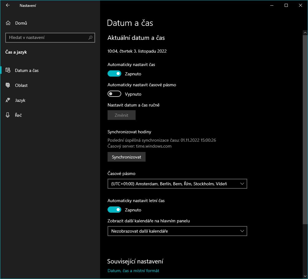 Je potřeba mít nastavenou českou republiku (nebo něco podobného) a několik přepínačů, které jsou ale ve výchozím nastavení zapnuté. Nevím jak v desítkách, ale aby se automaticky synchronizoval čas, nesmí se čas lišit příliš moc (pokud PC zapomene honiny a octne se několik let zpátky, tak synchronizace nefunguje, narozdíl od linuxu, který si čas podle internetu nastaví bez ohledu na rozdíl v čase).