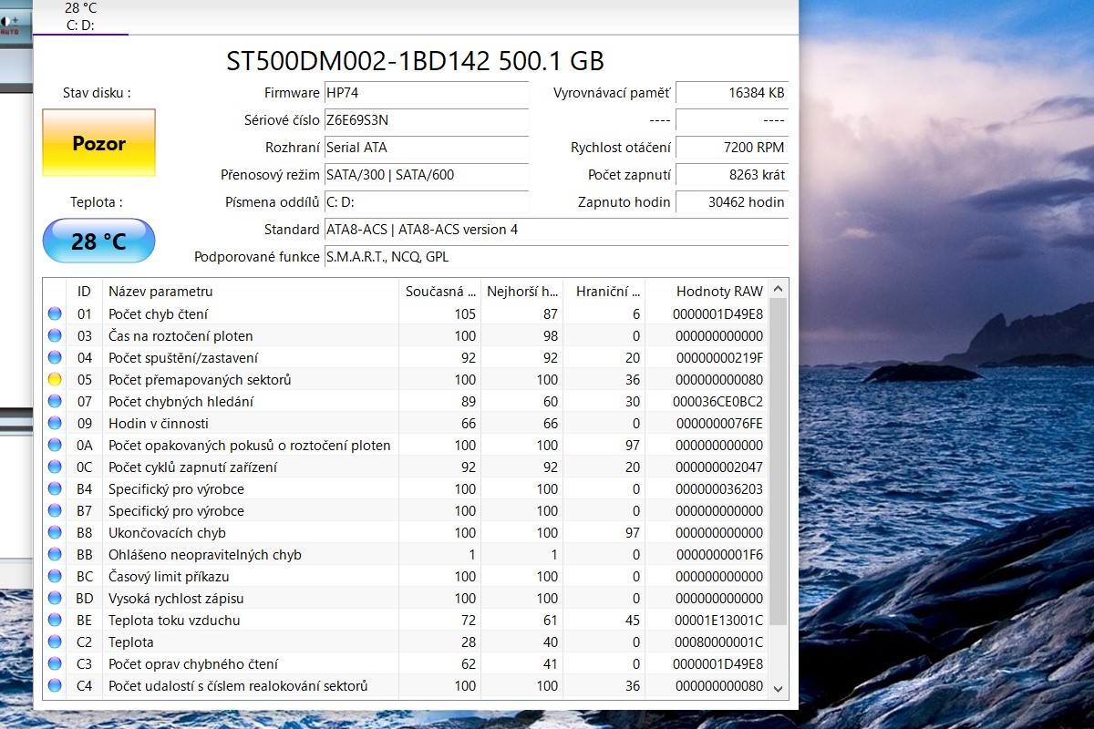 druhak jsi nebyl schopný si to okno "crystaldiskinfo" zvětšit myšem, ať vidíš celý výpis. tipuju když id:05 má 80(hex) chyb, že ty dole skryté c5,c6 taky nebudou nulové = ten disk je na vyhození.