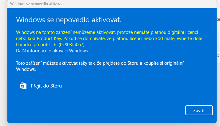 Ještě poznámka, ten tvůj chybový kód ti to píše nejspíš proto, že se snažíš aktivovat generický klíč bez nároku na digitální licenci na tom hardwaru, přičemž jsi nepoužil nejspíš ani klíč od tvé licence.