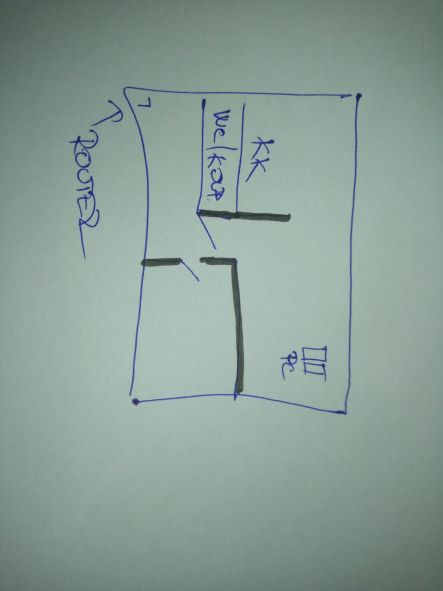 -> v podstatě přes jednu zeď, nebo jedny dveře.. nevim jak přesně prostupuje wifi signál, ale viz fotka.. černou jsou zdi-panel.. WC koupelna kuchyňskej kout jsou sololitový desky. router je u stropu, PCs jsou logicky na zemi, či u země..