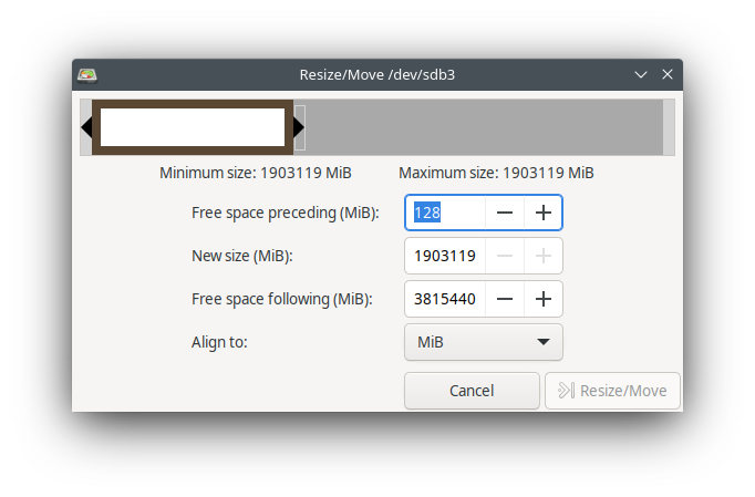 A teď to, na čem sem se zasek. Přes Gparted se pokouším rozšířit oddíl o zbývající volné místo. Bohužel Gparted mi to nechce umožnit, jediné co lze je s oddílem hýbat, nikoliv ho roztáhnout přes volné místo.