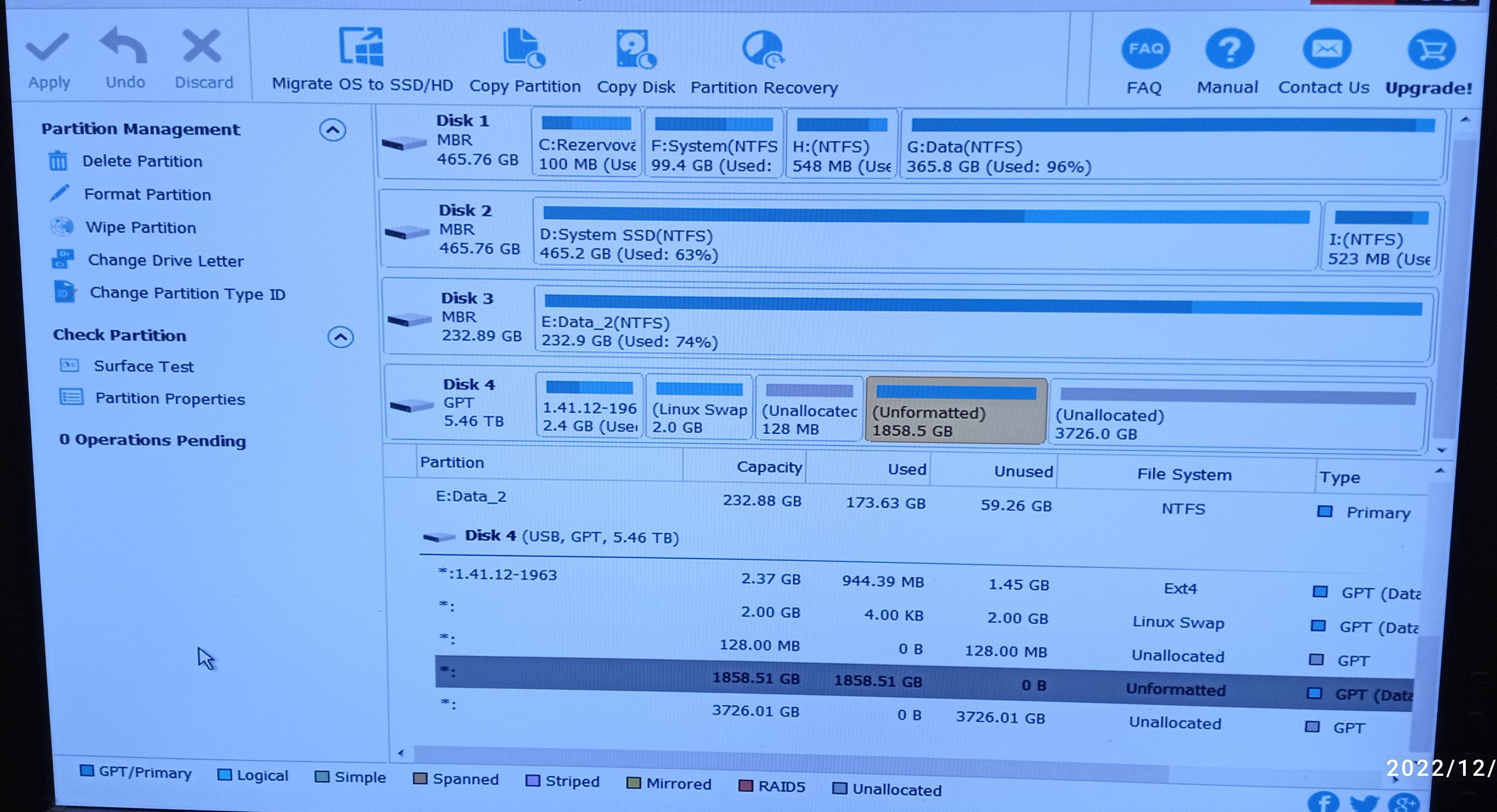 Opět následoval pokus v Mini tool a Gparted o rozšíření a mám si trhnout nohou.