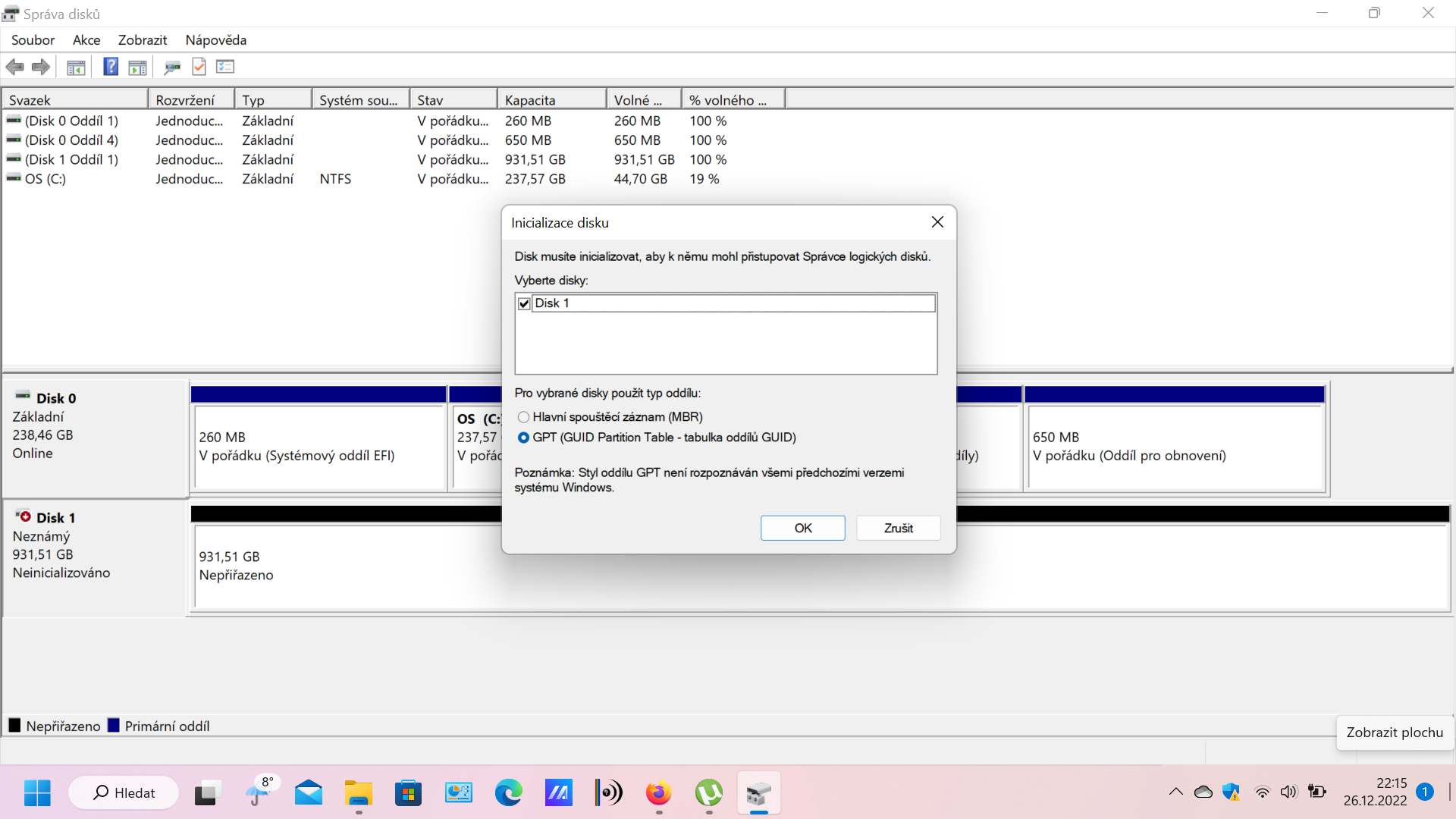 Tak to pomohlo. vše se vymazalo, ale ted to po mně chce disk inicializovat. a to ted nevím jaký typ…