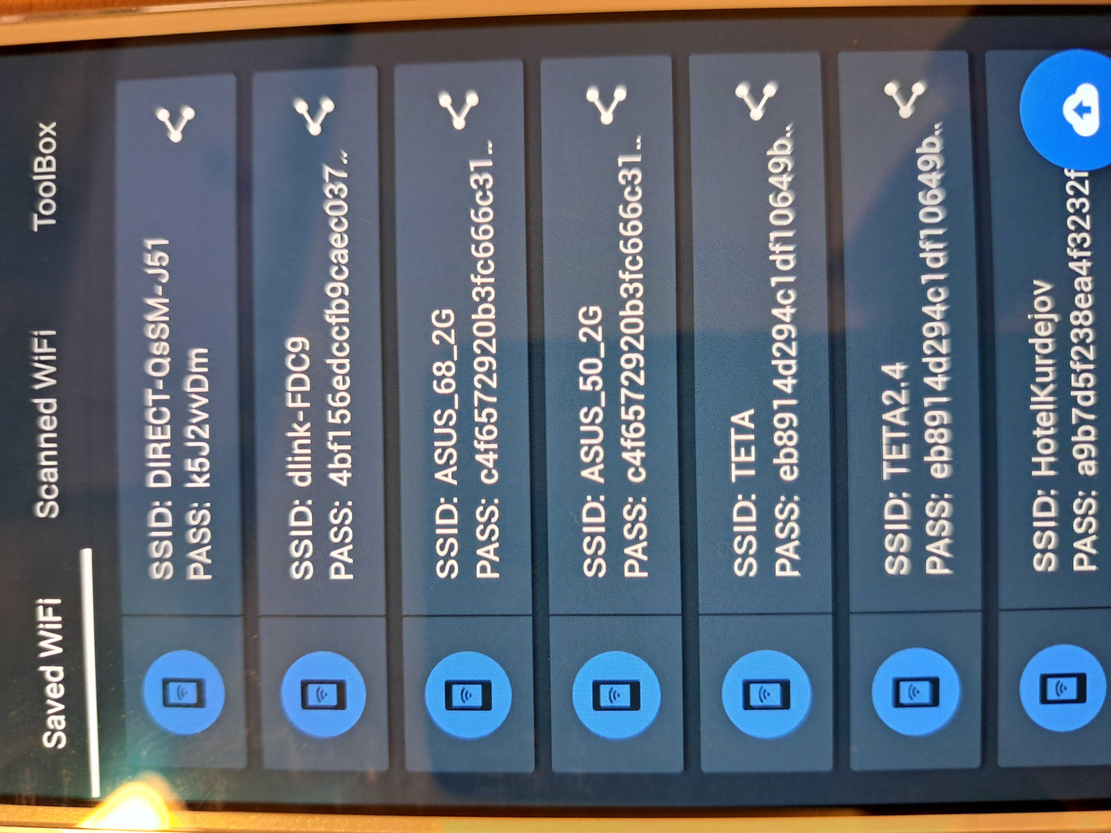 Dobrý den. Na telefonu Samsung Galaxy J5 (2016) chci zjistit hesla WiFi. Udělal jsem root telefonu. Nainstaloval aplikaci Wifi Password Recovery. Aplikace by měla zobrazit hesla viz. obr. 1. Místo toho zobrazuje nějakou ředu čísel a pímen viz. obr. 2. Zkoušel jsem i jiné aplikace, ale je to stejné. Nevíte, jak zobrazit hesla?