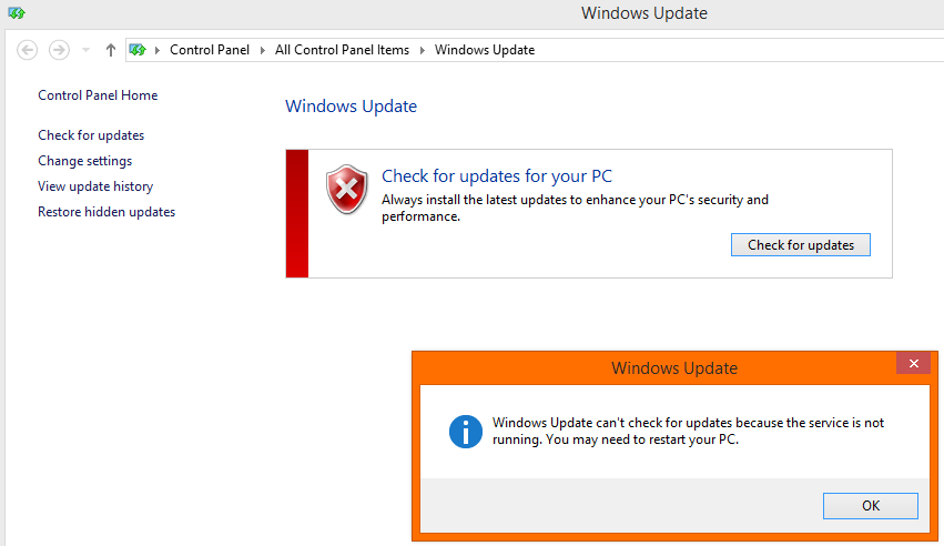 Po kliknutí na Check for updates, hlásí "Windows Update can't check for updates because the service is not running. You may need to restart your PC."